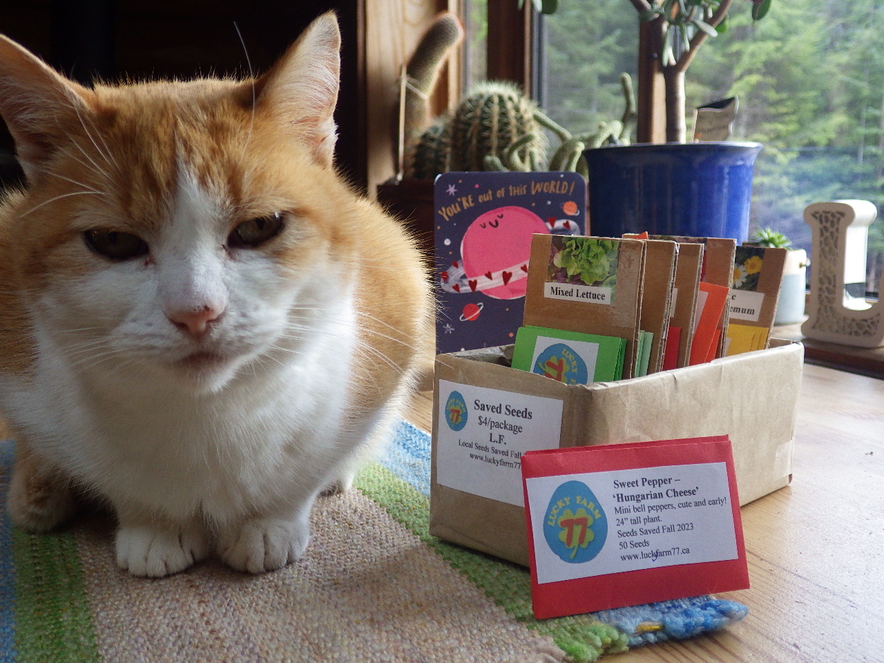 Wilma the Cat says: "Get your Super Saved Seeds Soon!". Luckyfarm77 saved seeds from 2023 are available at the Sointula Resource Centre Community Market Garden Stand. Seeds are selling fast, but we continue to replenish our stock every week. See you soon for more Luckyfarm77 growing adventures!