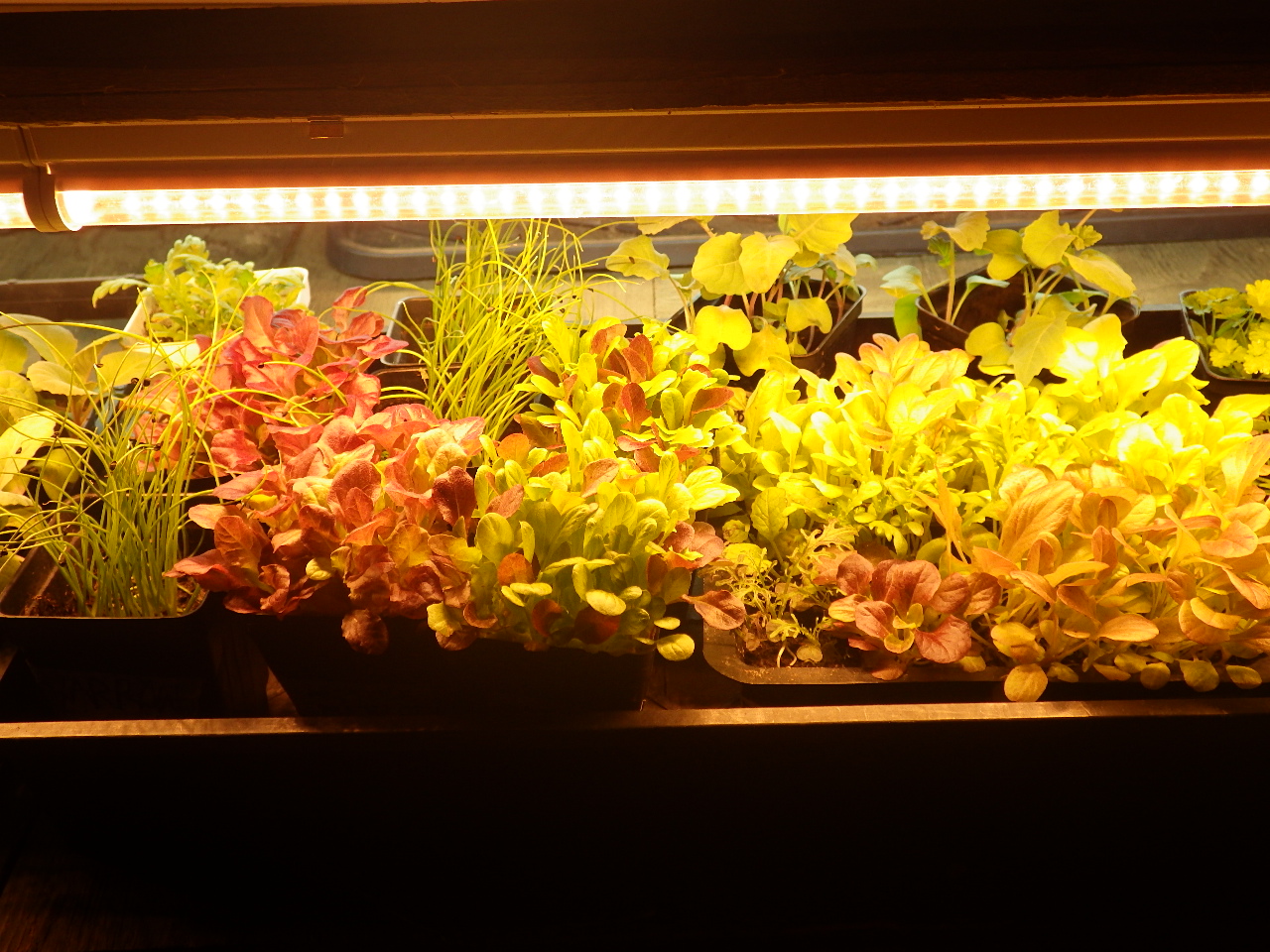 The new full spectrum LED grow lamps give the lettuce and onions a golden glow.