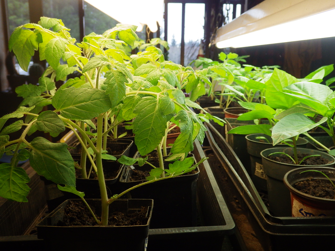 The tomatoes and sweet peppers are growing fast under the grow lamps. There are four kinds of tomatoes and three kinds of sweet peppers, all from our own saved seeds.