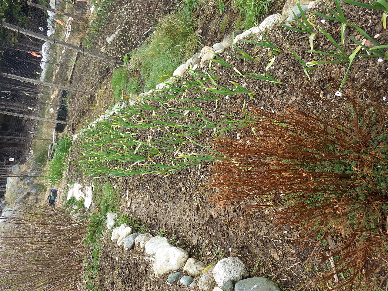 Here is the soft neck garlic coming up with a fresh coating of compost. That's St. John's Wort in the foreground. The bees will love the yellow flowers.