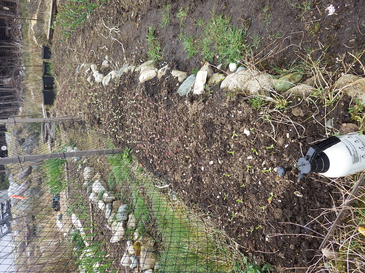 Tiny thin threads of lettuce started indoors has been transplanted out in the garden. The bed was fertilized with a layer of compost prior to planting.