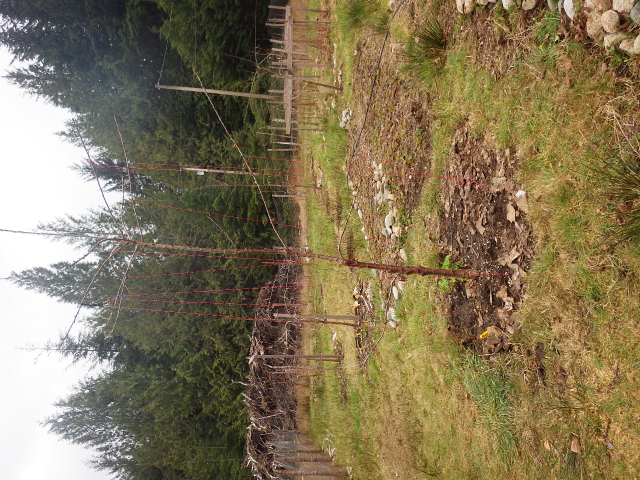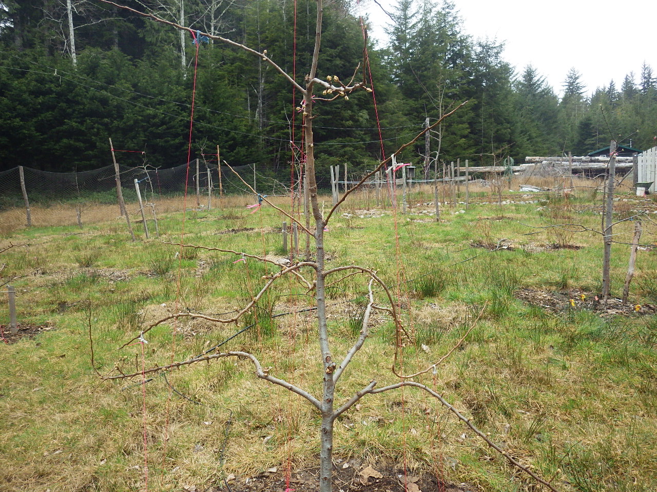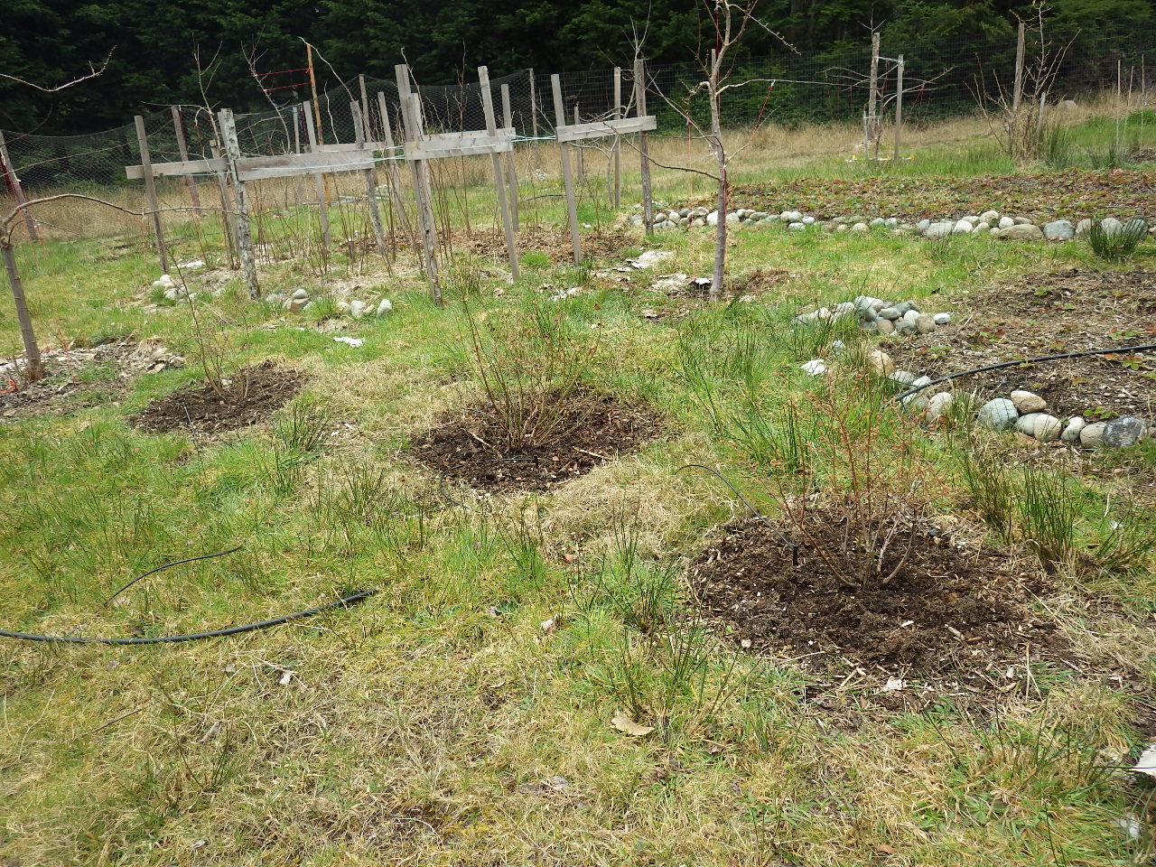 In the orchard, Linda has been busy weighing down the branches of the fruit trees with string and stakes. By lowering the branches, this will stimulate the fruit production. It will also make it easier to harvest the fruit!