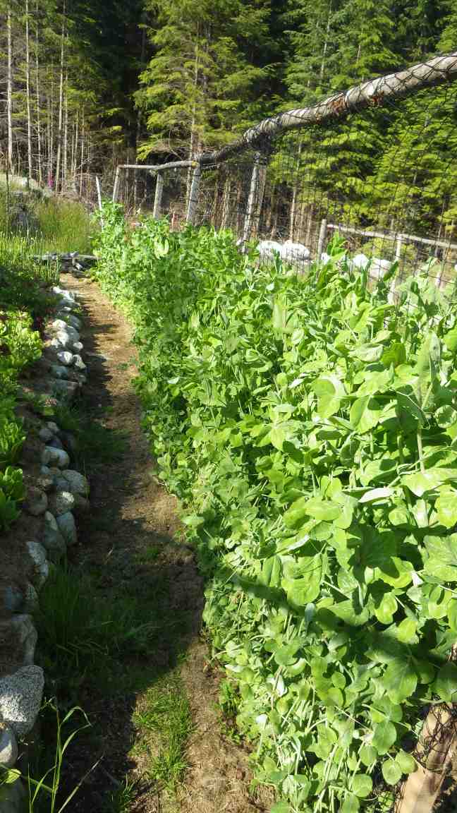 The snow peas and fresh shelling peas are growing fast along the fence line made from used fish net obtained from Ross Michelson. Thanks Ross!