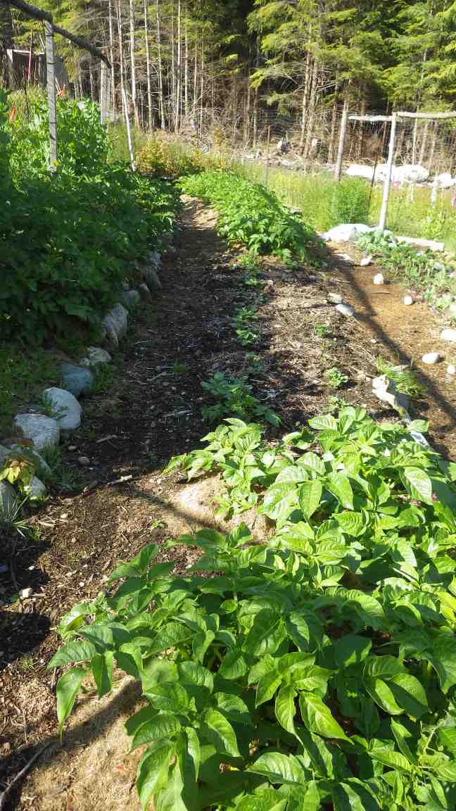 There are potatoes in various stages of growth in the next bed as well as more potatoes and perennial arugula next to the pea fence. Baby potatoes are now ready to harvest!