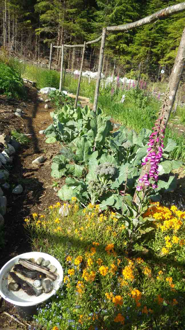 The are huge broccoli ready to be harvested next to the old pea fence. The orange flowers are a wild bee mix and we left the foxgloves growing because they look so great. There are some nice baby kale growing further down the row.