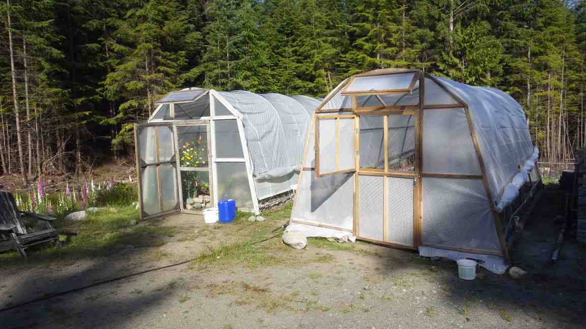 We finally finished our second greenhouse by converting the old "Shelterlogic" tarp shed. We bought the special woven greenhouse plastic from Midland Liquidators in Vancouver. Make sure that you buy an oversize sheet as the first one we bought was too small and the second one was "just right". Linda just loves how the sides roll up for ventilation.