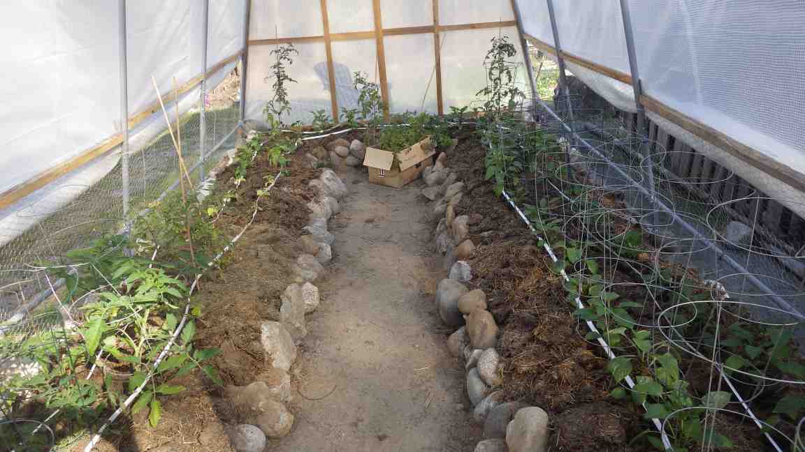 In the new second greenhouse, we have tomatoes on the left, cucumbers in between, and sweet peppers on the right. The white tubes are Tyvek drip irrigation that we mail order from Irrigro in Ontario.