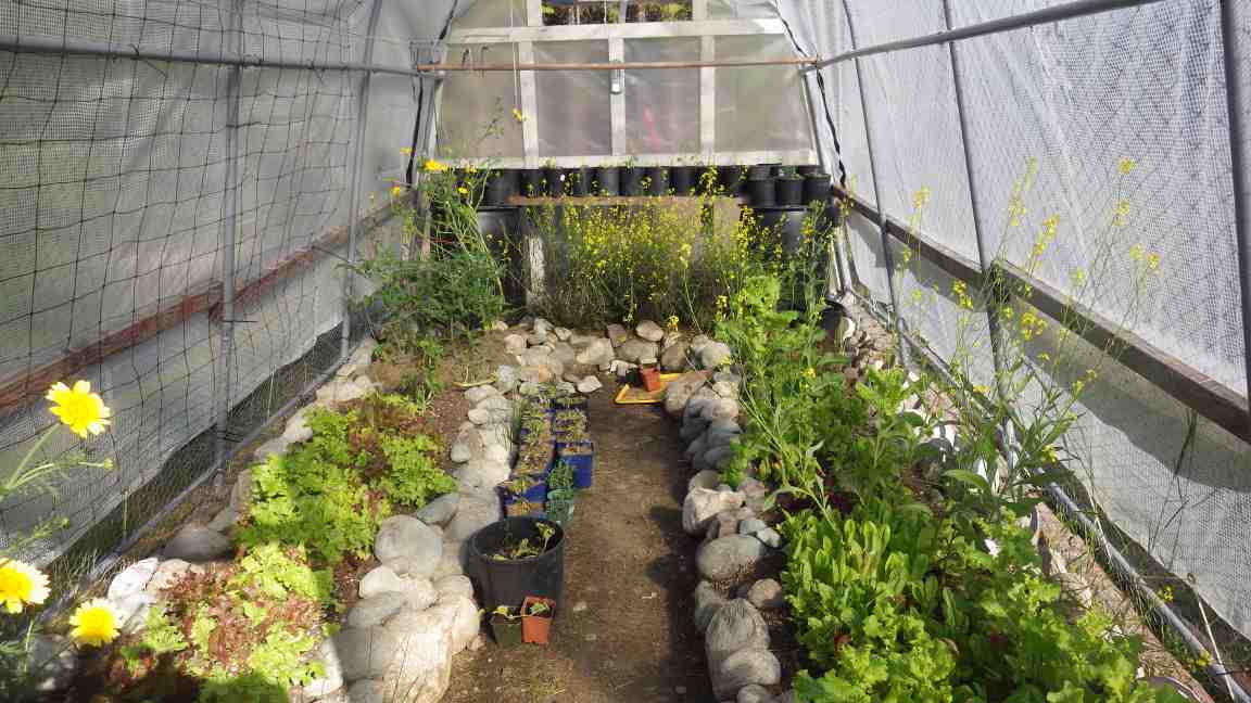 Here is the inside of the first greenhouse with chrysanthemum flowers in the foreground, lots of lettuce, and mustard greens going to seed. There is also basil in the pots on the shelf in the back.