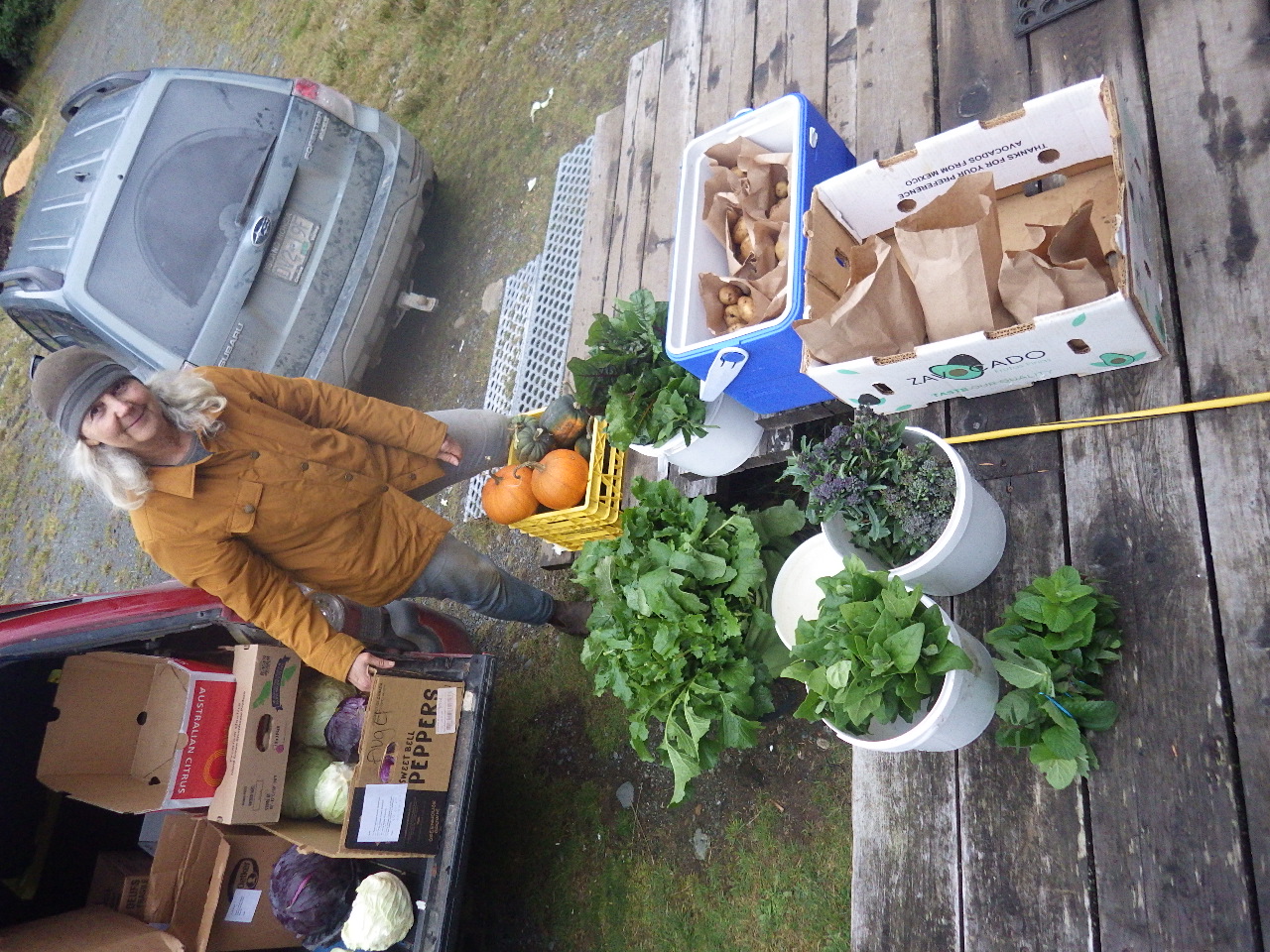Here is our associate Alex Morton from Slow Dog Farm transferring her produce to our truck for delivery to Sointula. Look at that abundance! What a great collaboration.