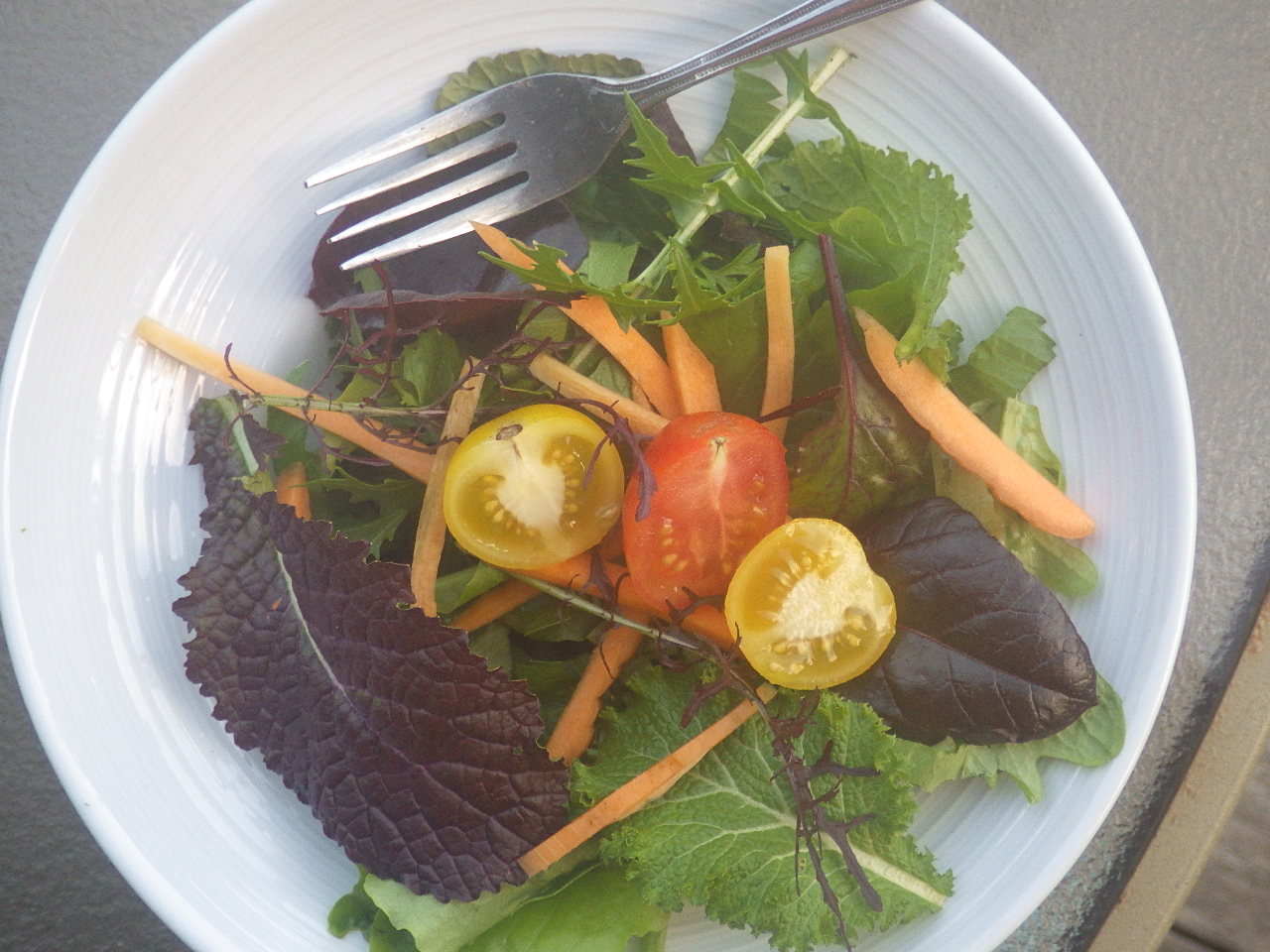The nice part about the late fall season is being able to reap the bounty of the garden every day. This salad again is all hyper-local with salad greens, spicy mustard greens, carrot sticks, and cherry tomatoes.