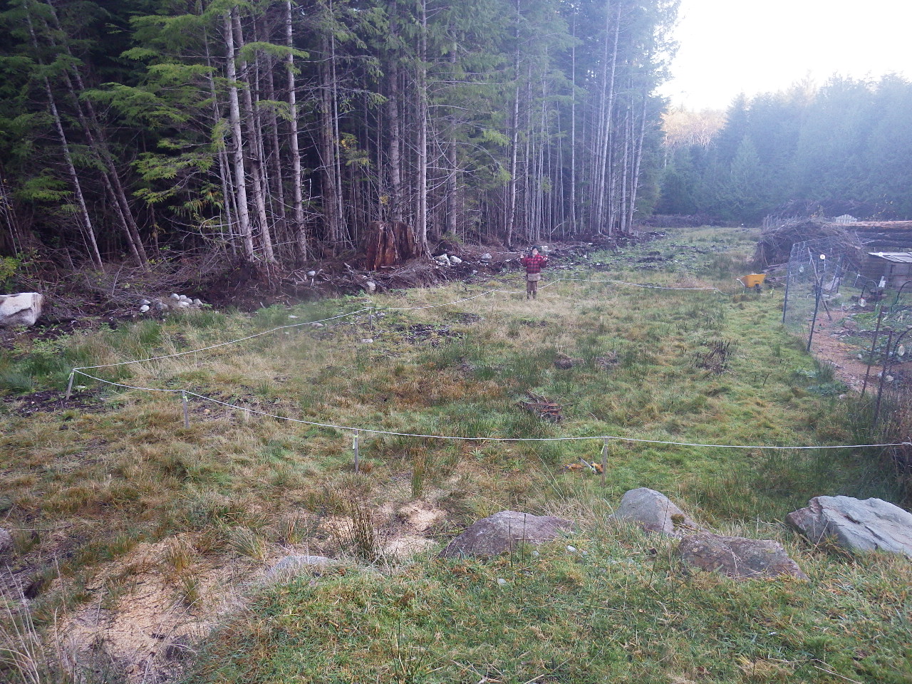 This is our staked out garden expansion area for next year with is about 40 by 70 feet. We will extend the beds from the existing garden (to the right) along the contours of the land then extend the fence around it. Can you see Petr with the carpenter's apron?