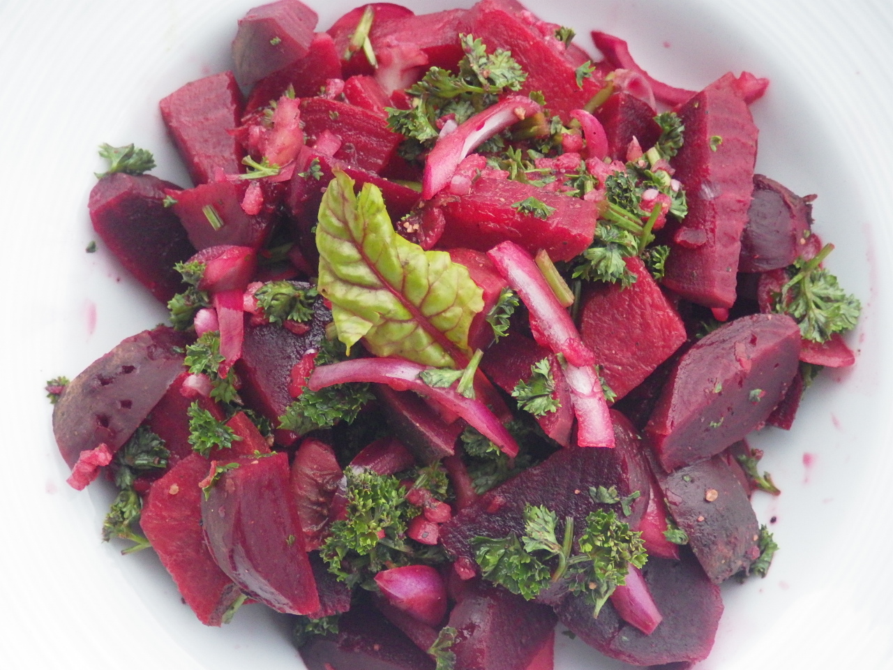Here is another hyper-local salad with cooked beets, beet leaves, sweet red onion, and parsley. All marinated in a store bought organic apple cider vinegar infused with locally foraged spruce tips.