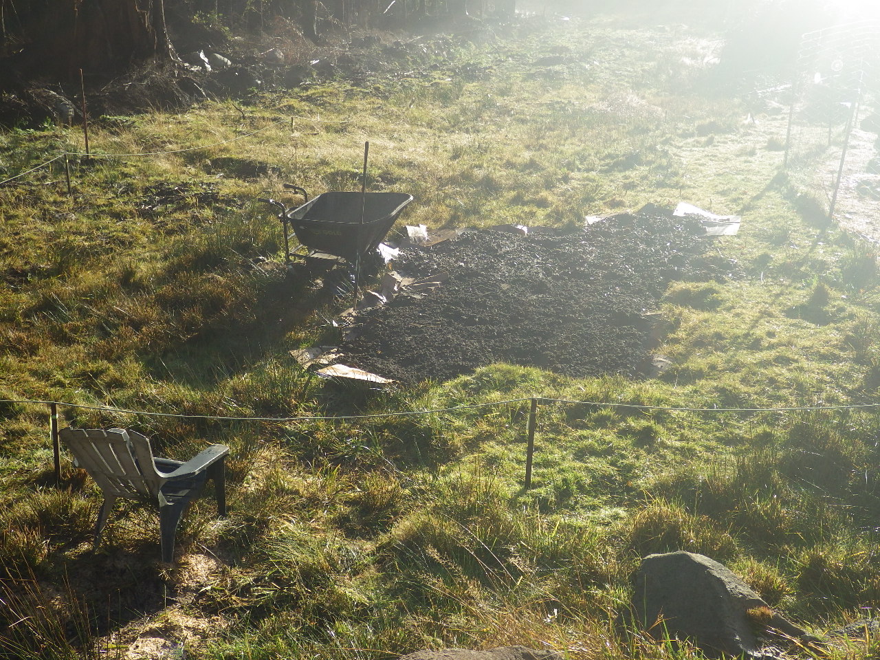 Here we are starting to fill in some holes and depressions in the expansion area using the tried and true cardboard and soil technique. First we layer cardboard over the grasses, swamp grass, and weeds to make sure they decompose. Then we put the soil on top of the cardboard to fill in the holes and depressions. Once we have smoothed out the expansion area, we will build the garden beds on top of everything using a combination of rocks to create small retaining walls along the contours. Then we will add more soil, seaweed, leaves, and manure to create the actual garden beds. So enjoyable to work on this sunny fall day. Thank goodness for the electric wheelbarrow!