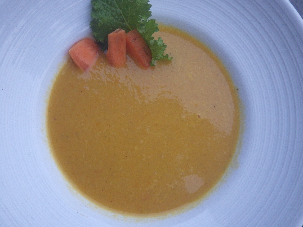 We had good success growing carrots this year thanks to Conner's hot tip to just sprinkle the seed on the ground without being too fussy. This is a nice power-blended carrot-potato-ginger soup garnished with a wasabi mustard green leaf. Only the ginger was store-bought.