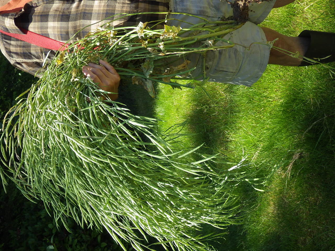 Aside from fresh produce available for harvest this time of year, we also are harvesting seeds. Here is one Pac Choi plant gone to seed. It was chosen because it was a volunteer plant that survived and thrived all winter long and into the early summer, indicating strength and vitality. Linda has many brown paper bags currently hanging from the ceiling of her painting studio, drying a variety of seeds that she has recently harvested.