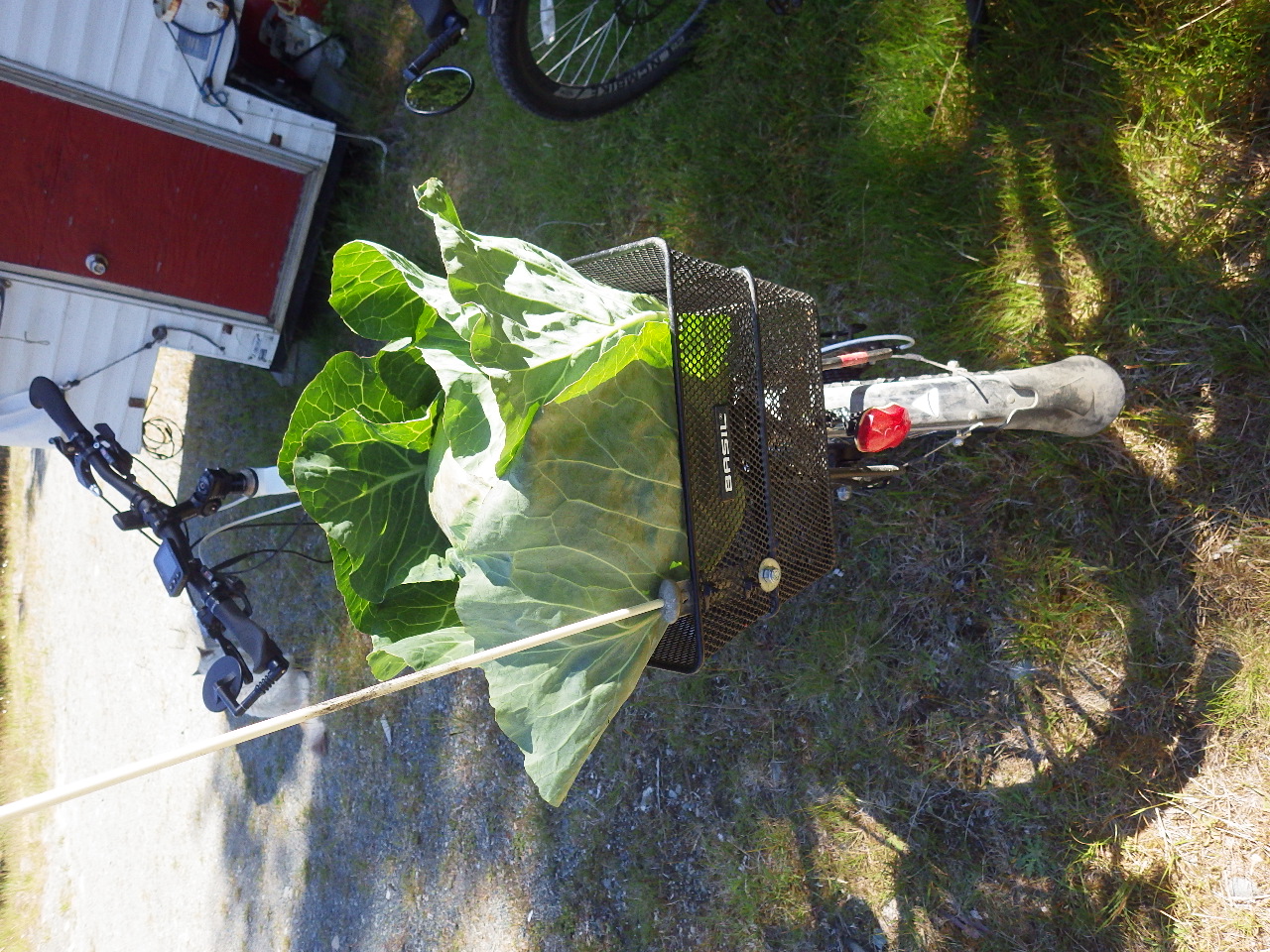 We're off on our ebikes to make a local delivery in Mitchell Bay. Along with our salad greens, celery, fresh roasted pumpkin seeds, this 8 pound gorgeous cabbage was added from Slow Dog Farm.