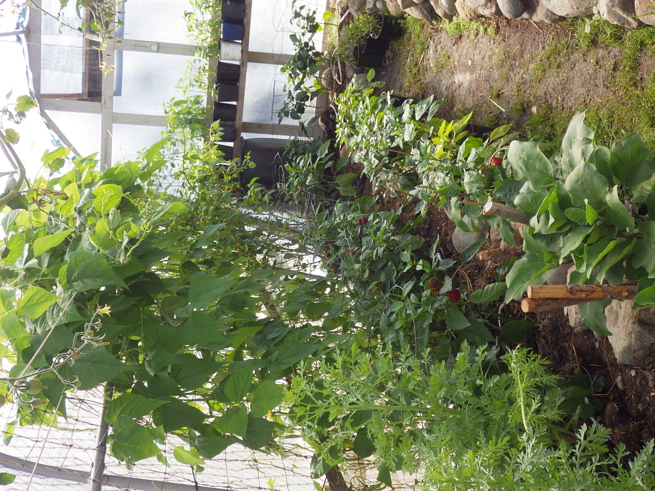More green beans hanging on the page wire trellis. Sweet peppers below and in pots. We chop up and freeze the sweet peppers, which last us all winter long.