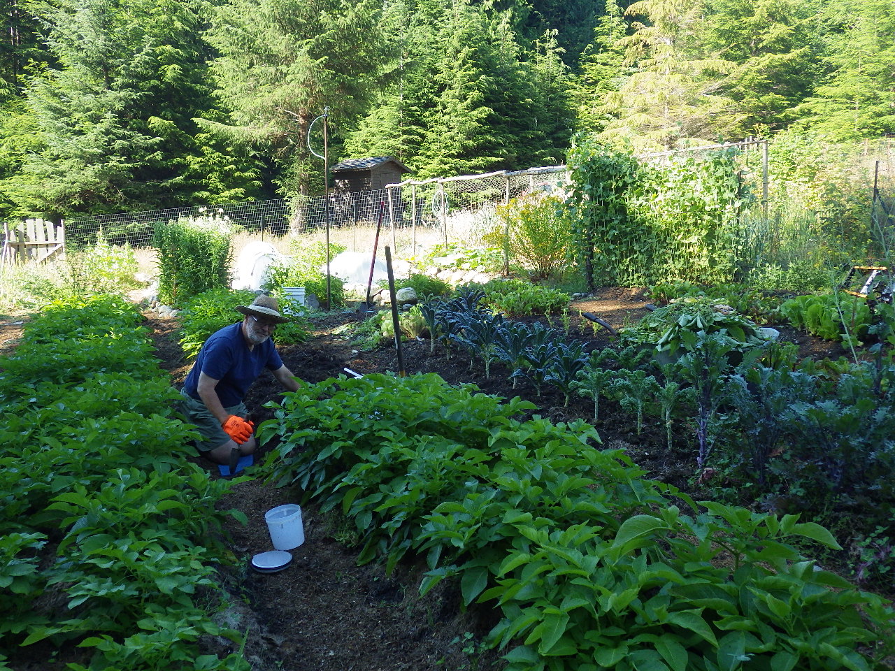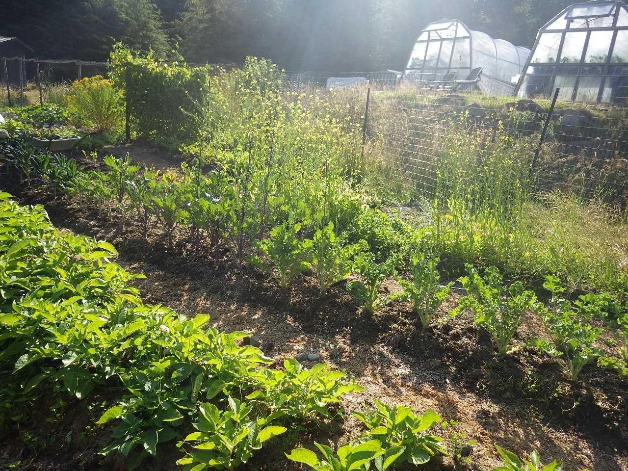 Potatoes and rows of kale in the garden expansion with the two greenhouses overlooking above the retaining wall.