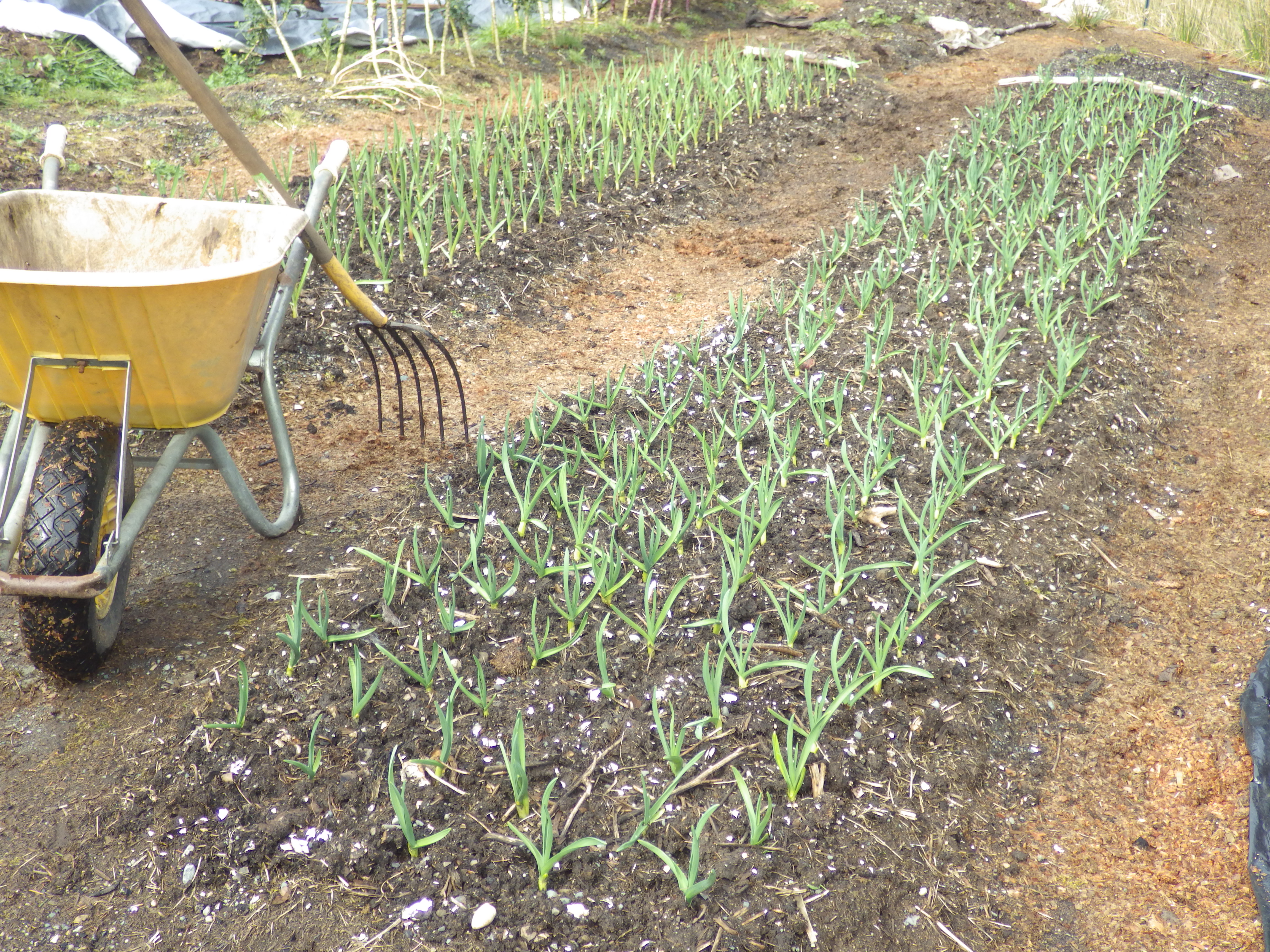 Linda also planted 500 garlic cloves in the fall, which are starting to grow fast in the springtime. We've just given the garlic a nice feed of fresh compost.