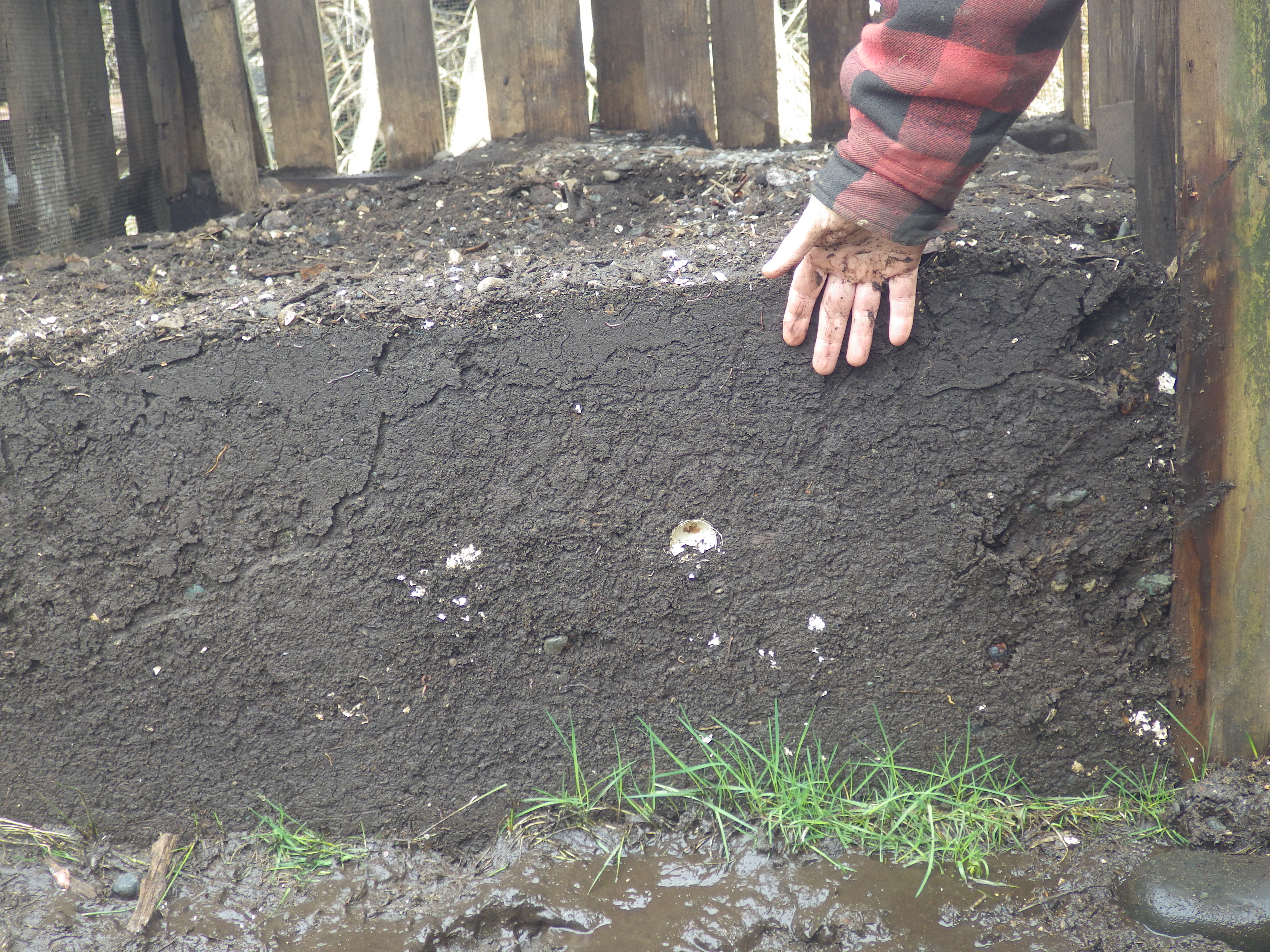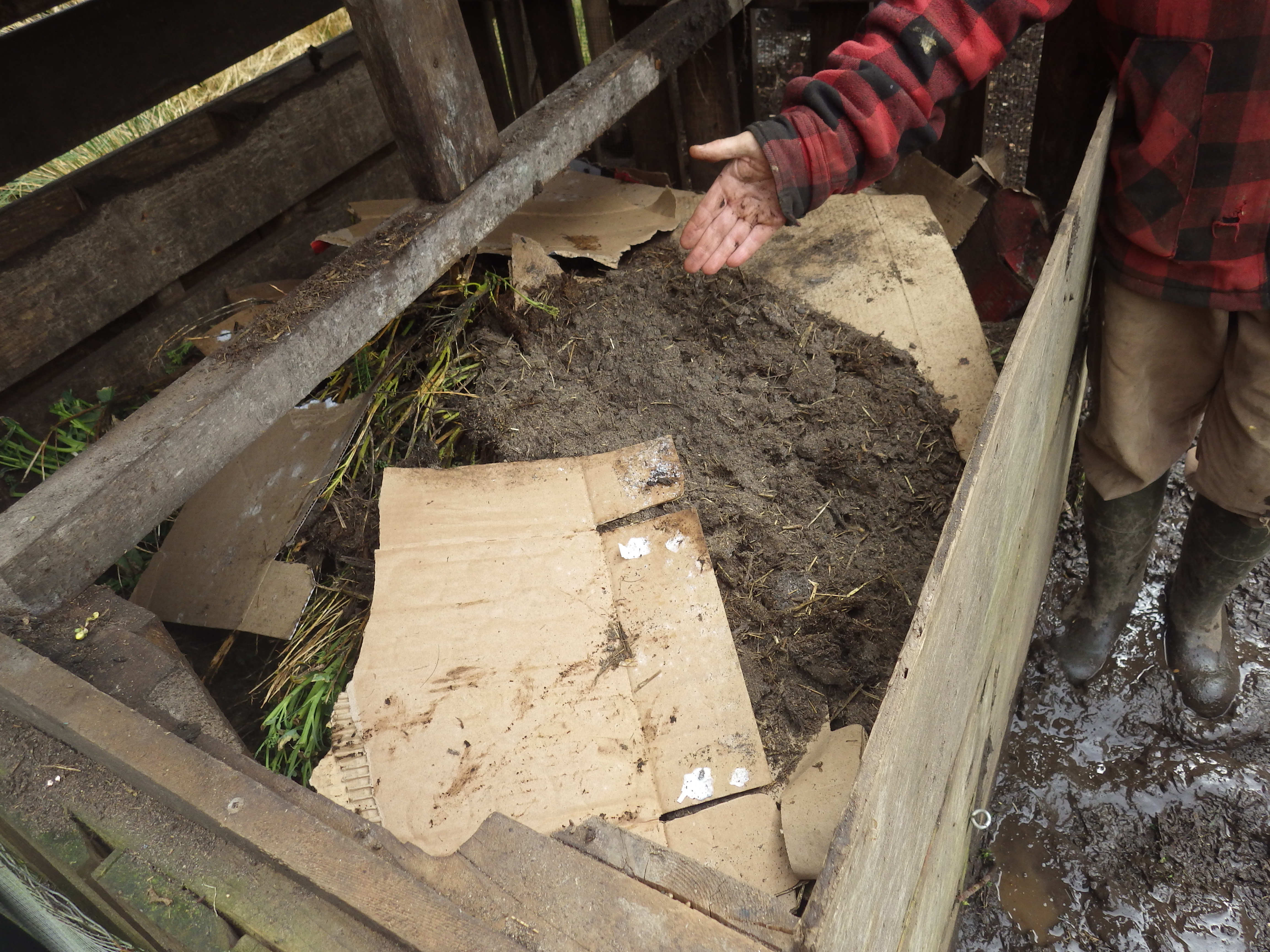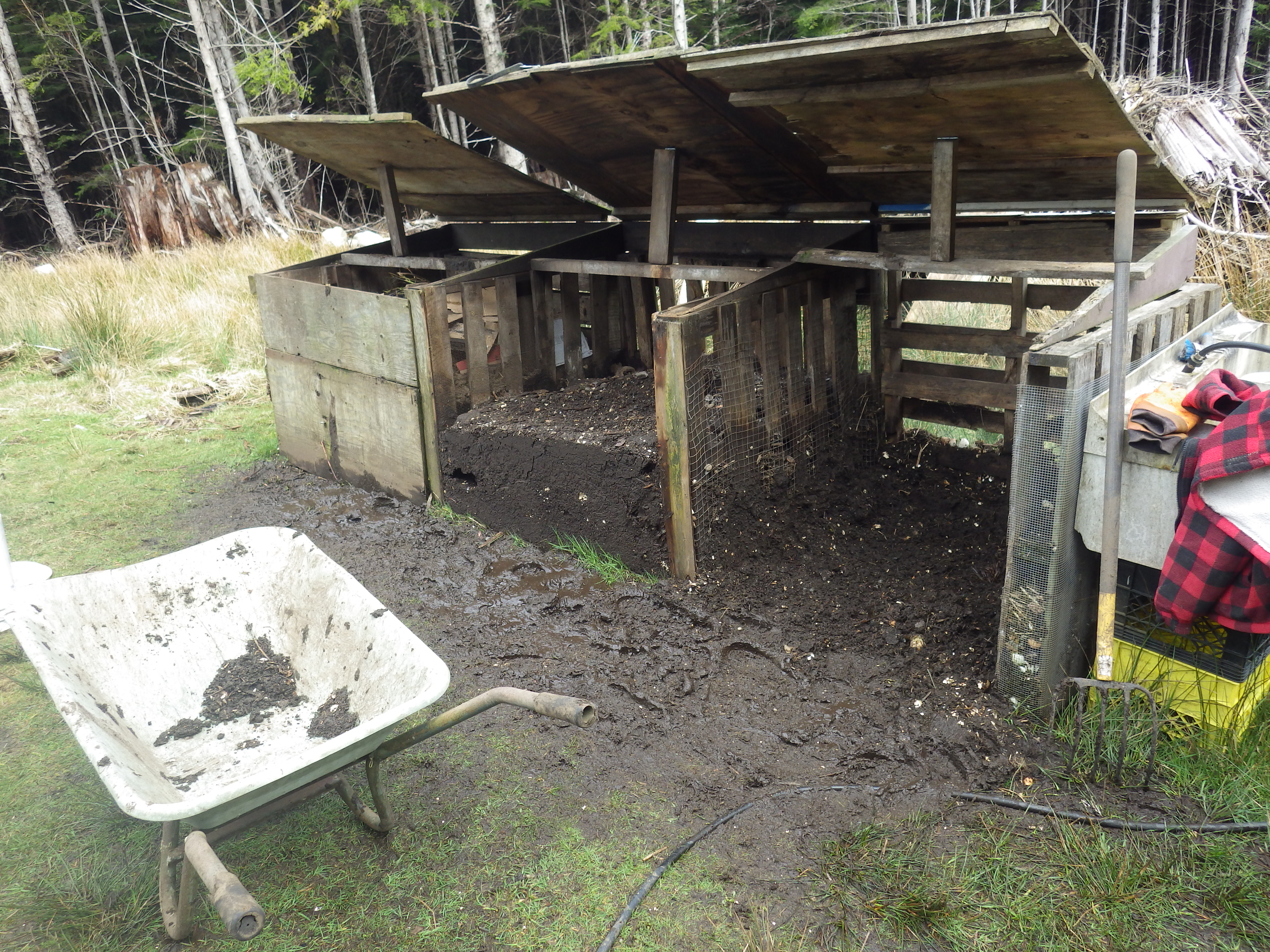 Look at all the black gold that has been composting for the past 8 months. We are now busy spreading this home made fertilizer on our garden beds from two compost bins like this. Each bin fills about 30 wheelbarrows of compost. Thanks so much to all our Malcolm Island food scrap and manure donors throughout the year.