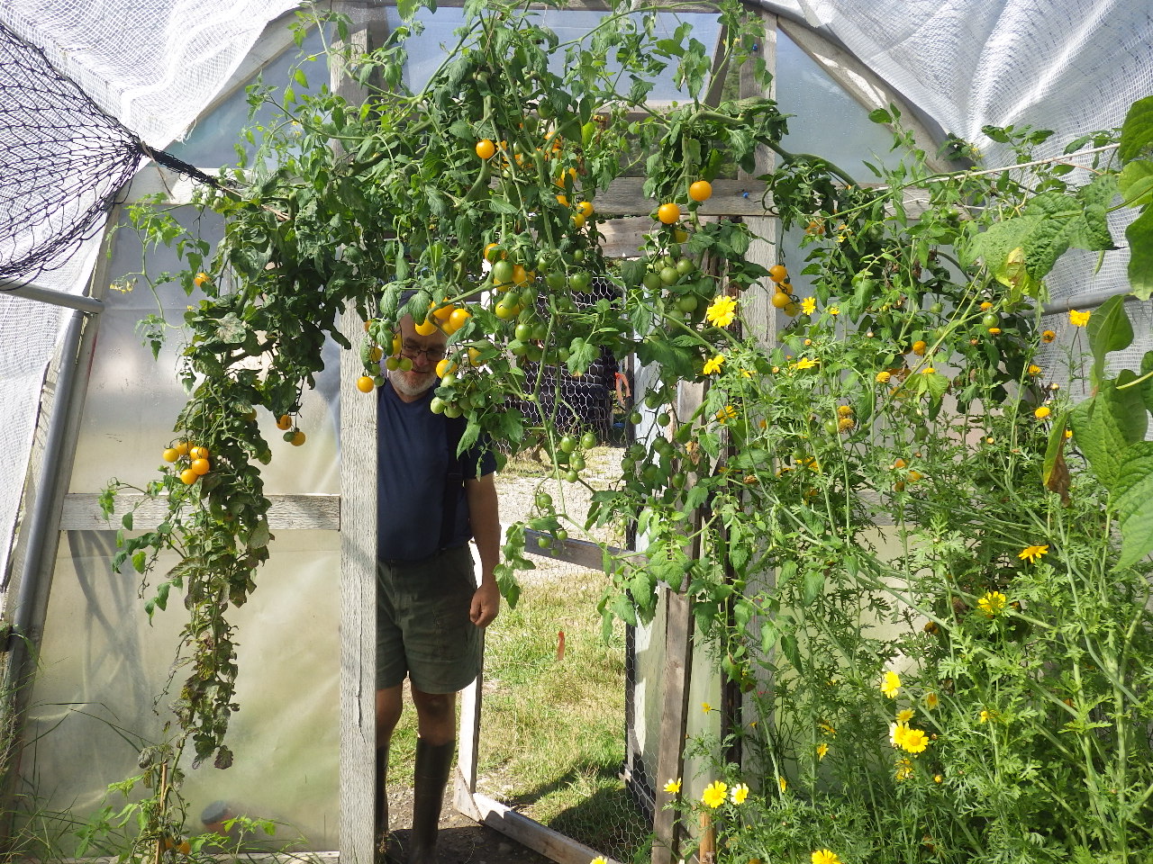 What a jungle in the tomato house! This is one tomato plant -- "yellow school bus", a cherry tomato that can grow up to 12 feet high! This is from our own saved seed stock. It's delicious and very popular with our customers!