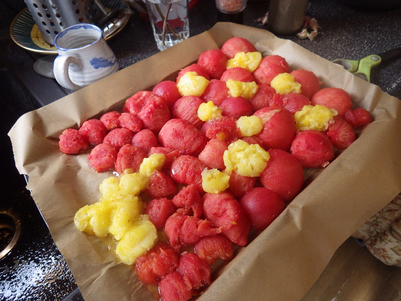 Despite the cold summer, there was such a profusion of late tomatoes. We made marinara sauce by first blanching and pealing the red and yellow tomatoes. Then we baked the tomatoes along with onions, carrots, garlic, and herbs. The baked concoction is then blended and frozen in zip-lock baggies. This makes an excellent base for spaghetti, pizza, etc.