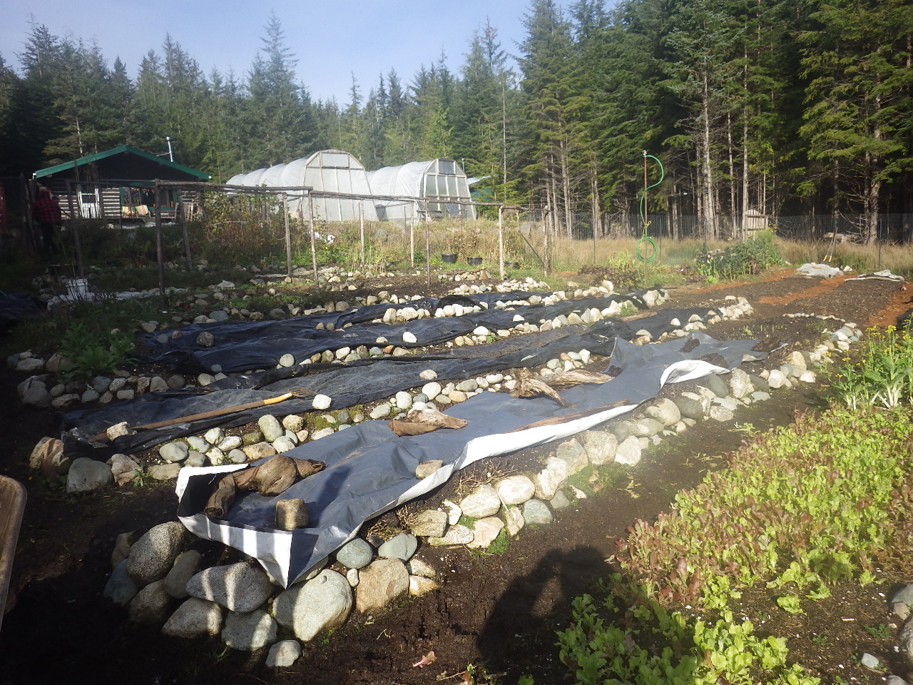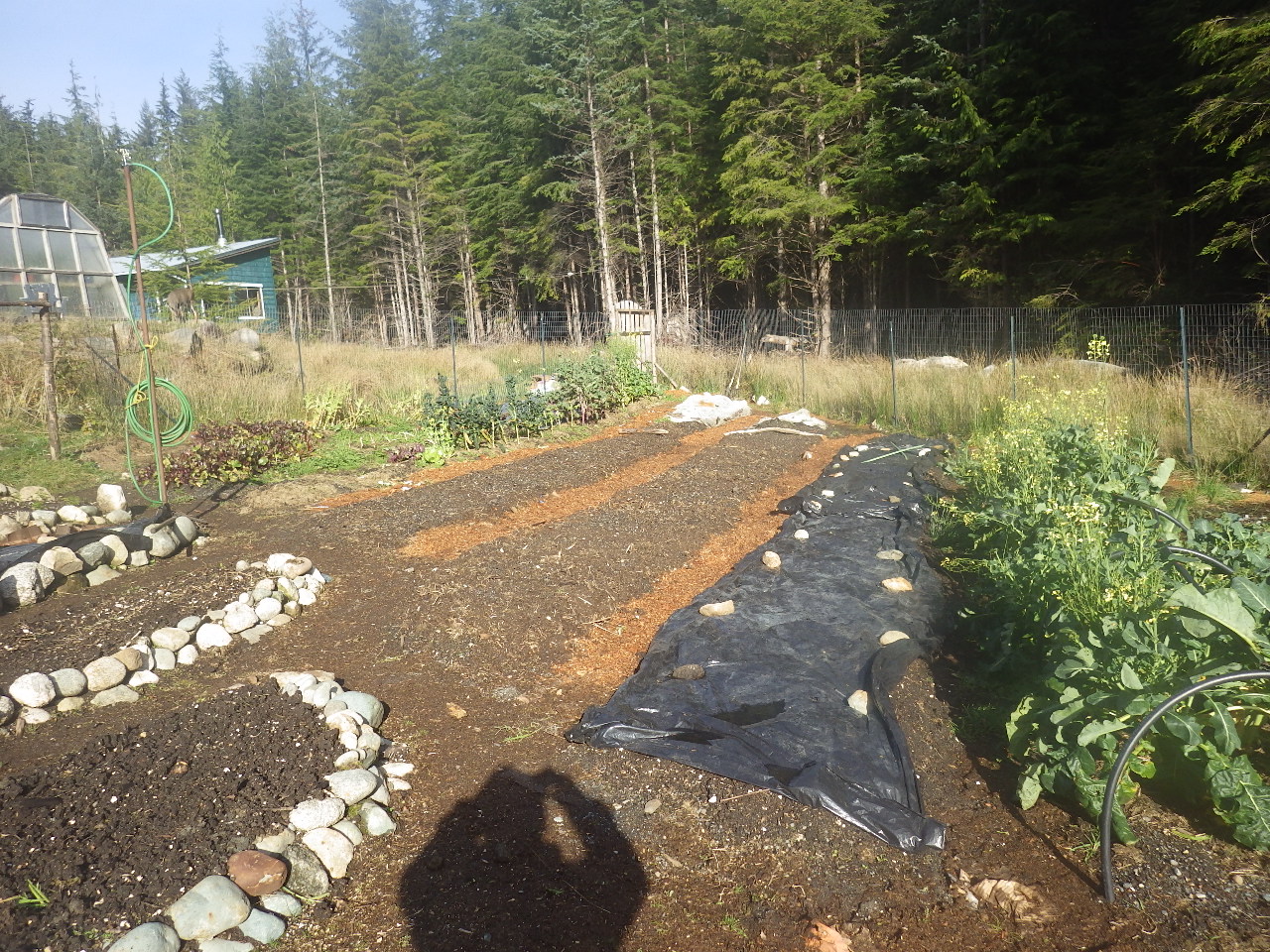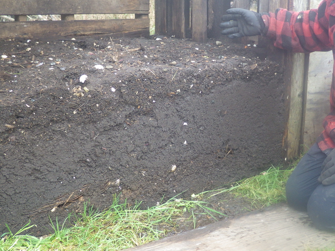 We added the lovely compost to our garden beds and then for the winter covered them with plastic or old tarps to keep the rain from washing out the nutrients. We also added seasoned horse, pig, and chicken manure that we kept under a tarp all summer long to heat it up so it's safe to put in our garden. Thanks Terah and Gretchen from Mitchell Bay! We will continue to add seaweed and grass clippings all winter long to build up the beds under the tarps and plastic.