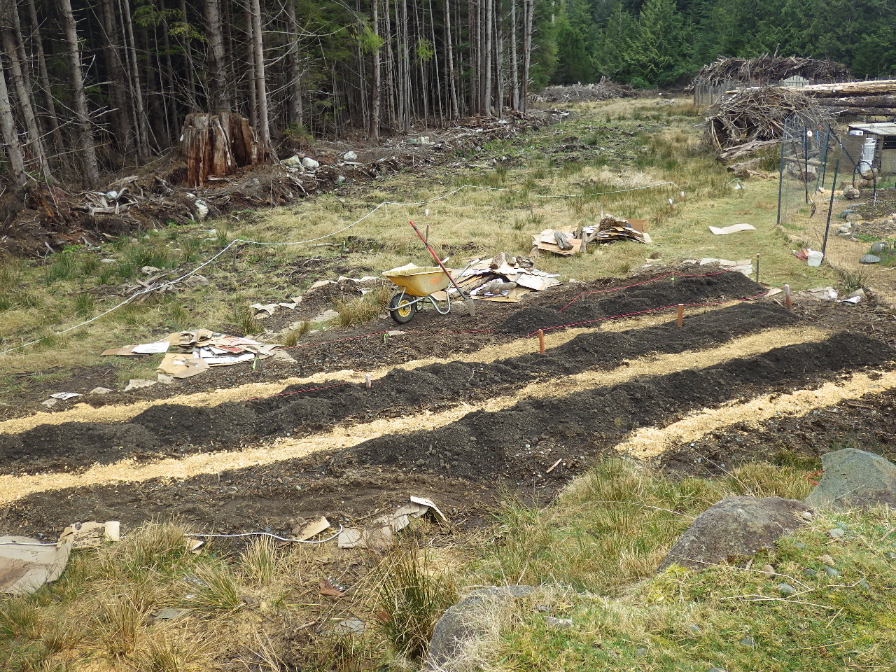 Look at all the black gold that has been composting for the past 8 months. We are now busy spreading this home made fertilizer on our garden beds from two compost bins like this. Each bin fills about 30 wheelbarrows of compost. Thanks so much to all our Malcolm Island food scrap and manure donors throughout the year.
